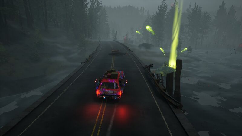 The Whispering Replicant driving along a bridge, while being attacked by a Belching Barnacle from below